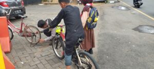 Melihat hal tersebut, anggota pun segera mendatangi mereka. Dan ternyata, sepeda pancal yang dituntun tersebut mengalami kerusakan.