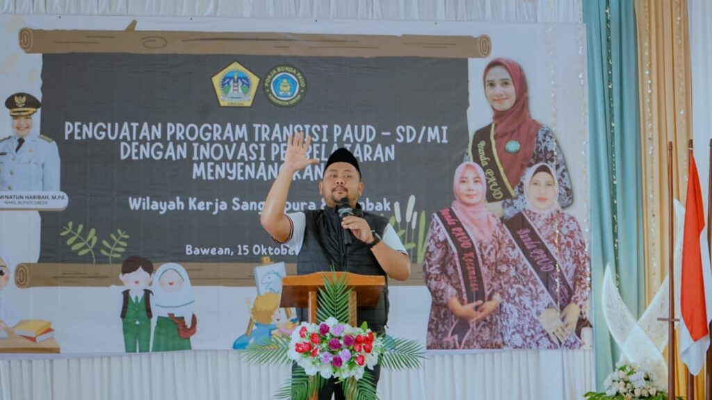Hal ini disampaikan Bupati Gresik Fandi Akhmad Yani saat membuka penguatan program transisi PAUD-SD/MI di wilayah kerja Sangkapura dan Tambak. Di dampingi BUNDA PAUD Kabupaten Gresik Nurul Haromaini Ali Akhmad Yani. Kegiatan digelar di yayasan pondok pesantren Hasan Jufri Sangkapura, Minggu (15/10/2023).
