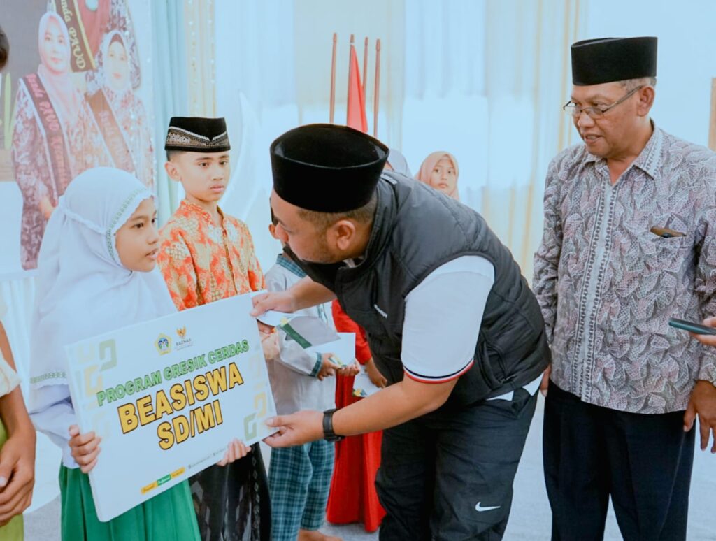 Pada kesempatan tersebut turut diserahkan santunan anak yatim dan Beasiswa untuk siswa SD/MI dan siswa SMP/MTS dari BAZNAS oleh Bupati Gresik.