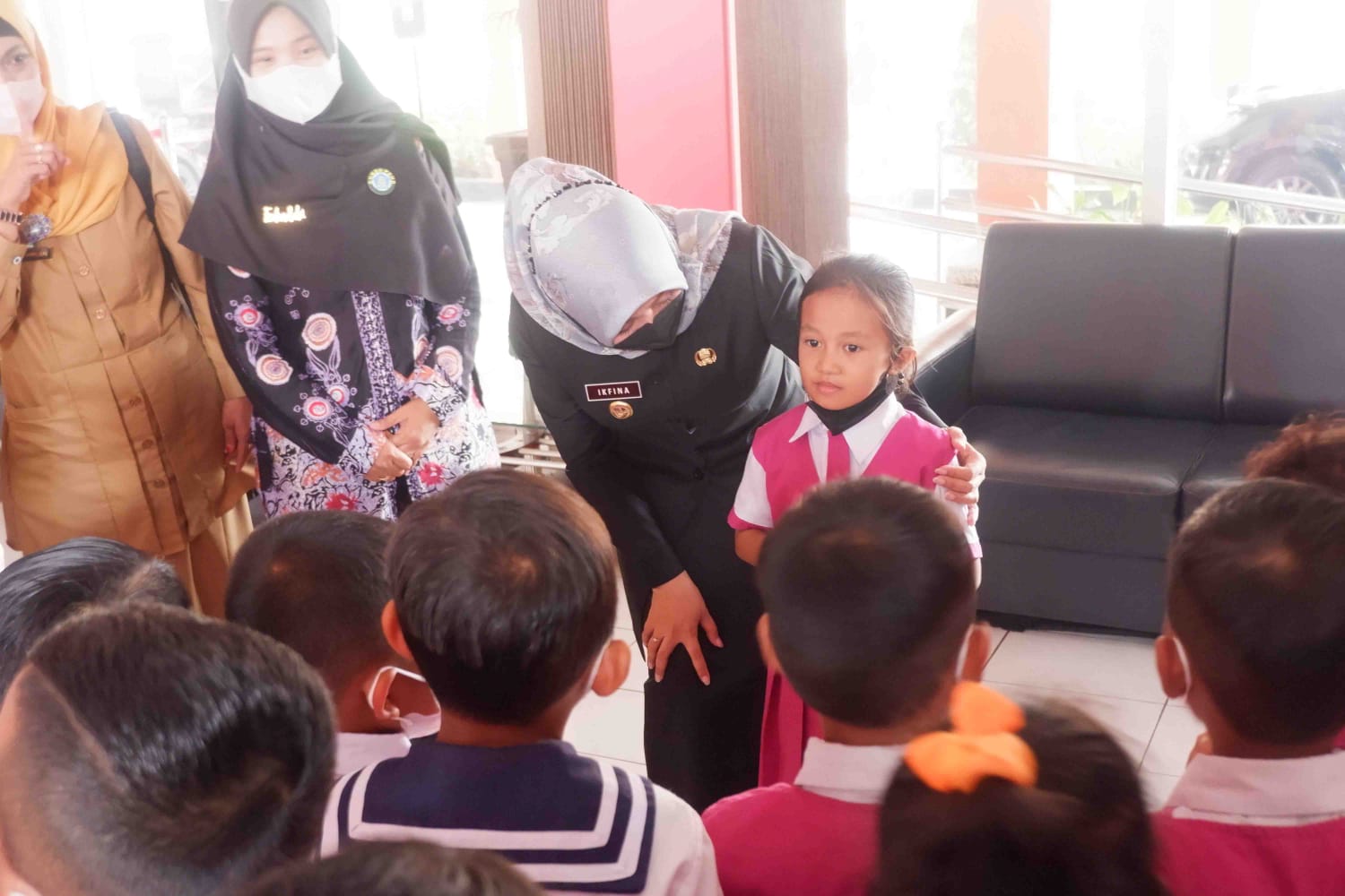 Setelah memperkenalkan diri kepada para siswa TK Dharma Wanita Punggul, Bupati Ikfina lalu mengajak para siswa untuk naik ke lantai dua Gedung Sekretariat Daerah Kabupaten Mojokerto untuk menuju ke ruang kerja Bupati Mojokerto.