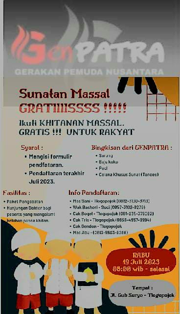 Kali ini Gerakan Pemuda Nusantara (GENPATRA) melalui bakti sosialnya akan mengadakan sunatan massal untuk masyarakat umum yang akan dikhitan secara langsung oleh Dr syahid mujahidin yang rencananya akan diselenggarakan pada tanggal 19 juli 2023 di simpang tiga petro oxo Jalan Raya Gubernur Suryo Tlogopojok.