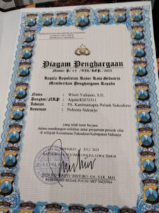Anugerah penghargaan tersebut diberikan secara langsung oleh Kapolresta Sidoarjo Kombespol Kusumo Wahyu Bintoro pada acara peringatan Hari Bhayangkara ke 77 tahun 2023, yang diselenggarakan di Mapolresta Sidoarjo. Pada (01/07/2023).