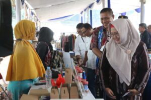 Selepas penyerahan sembako secara simbolis, Bu Min, begitu wabup kerap disapa, tampak bersemangat walaupun di tengah hujan berkeliling di tiap-tiap stand bersama Staf Khusus (Stafsus) III Menteri BUMN, Arya Sinulingga. Disini, berbagai produk mulai dari makanan dan minuman, pakaian, kerajinan tangan, hingga jasa rias ditampilkan.