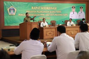” _Panjenengan_ semua akan menjadi wasit dalam proses seleksi PPPK ini. Dinamikanya pasti banyak, tetapi saya harapkan _panjenengan_ harus berdiri tegak lurus dan menjunjung tinggi profesionalitas,” ujar Bupati Gresik Fandi Akhmad Yani saat membuka rakor persiapan seleksi teknis penilaian kesesuaian PPPK jabatan fungsional guru, di ruang Mandala Bakti Praja, Rabu (23/11).