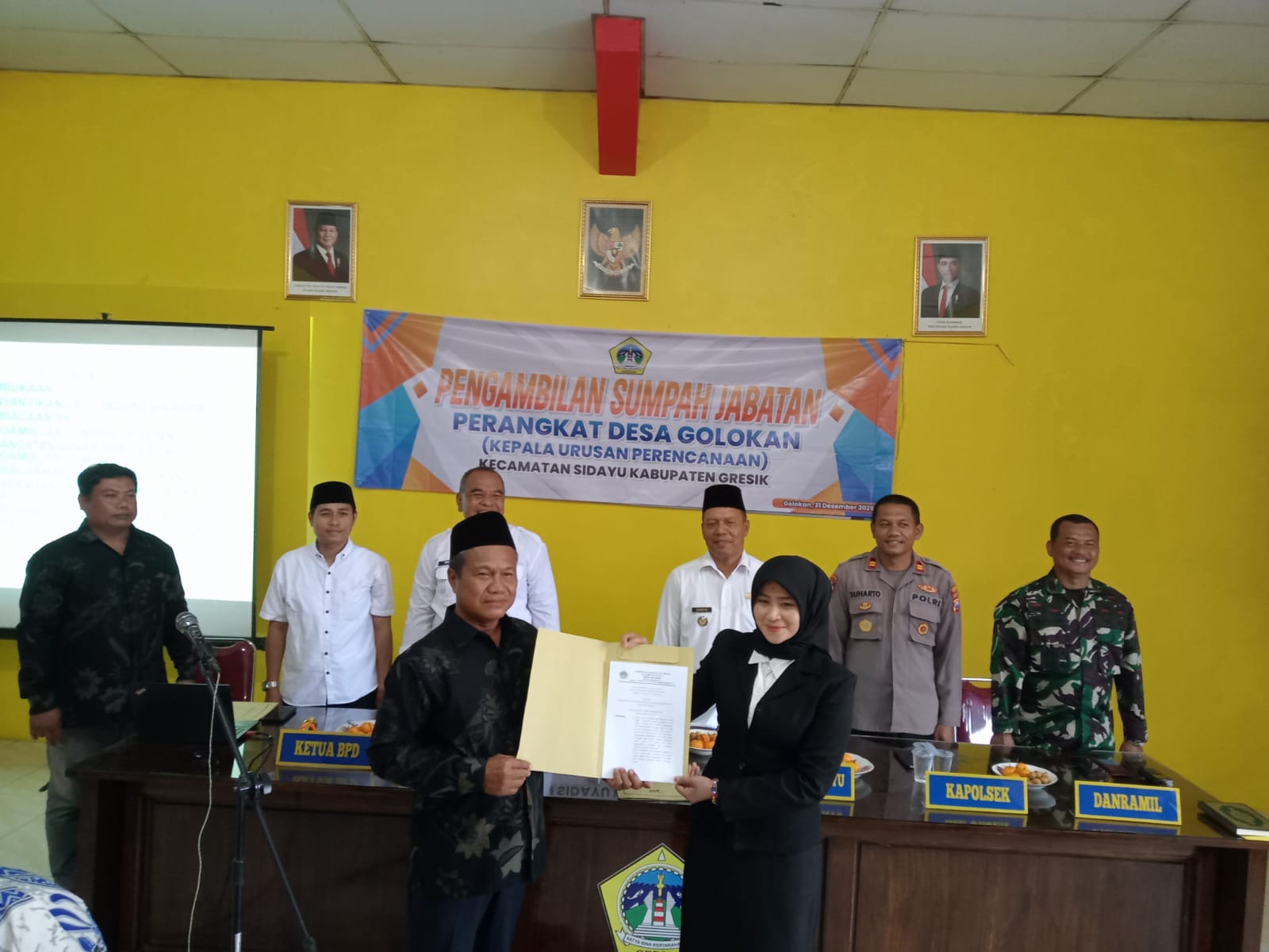 Gresik https://mediarestorasiindonesia.co.id Kepala Desa Golokan, Kecamatan Sidayu, Kabupaten Gresik, Muslikan, secara resmi melantik dan mengambil sumpah jabatan Latifatul Uliyah sebagai Kepala Urusan (Kaur) Perencanaan dalam prosesi khidmat di Balai Desa Golokan. Pelantikan tersebut dilaksanakan setelah yang bersangkutan dinyatakan lolos seluruh tahapan penjaringan dan penyaringan perangkat desa (P3D) sesuai ketentuan peraturan perundang-undangan.Pada 31/12/2025.