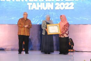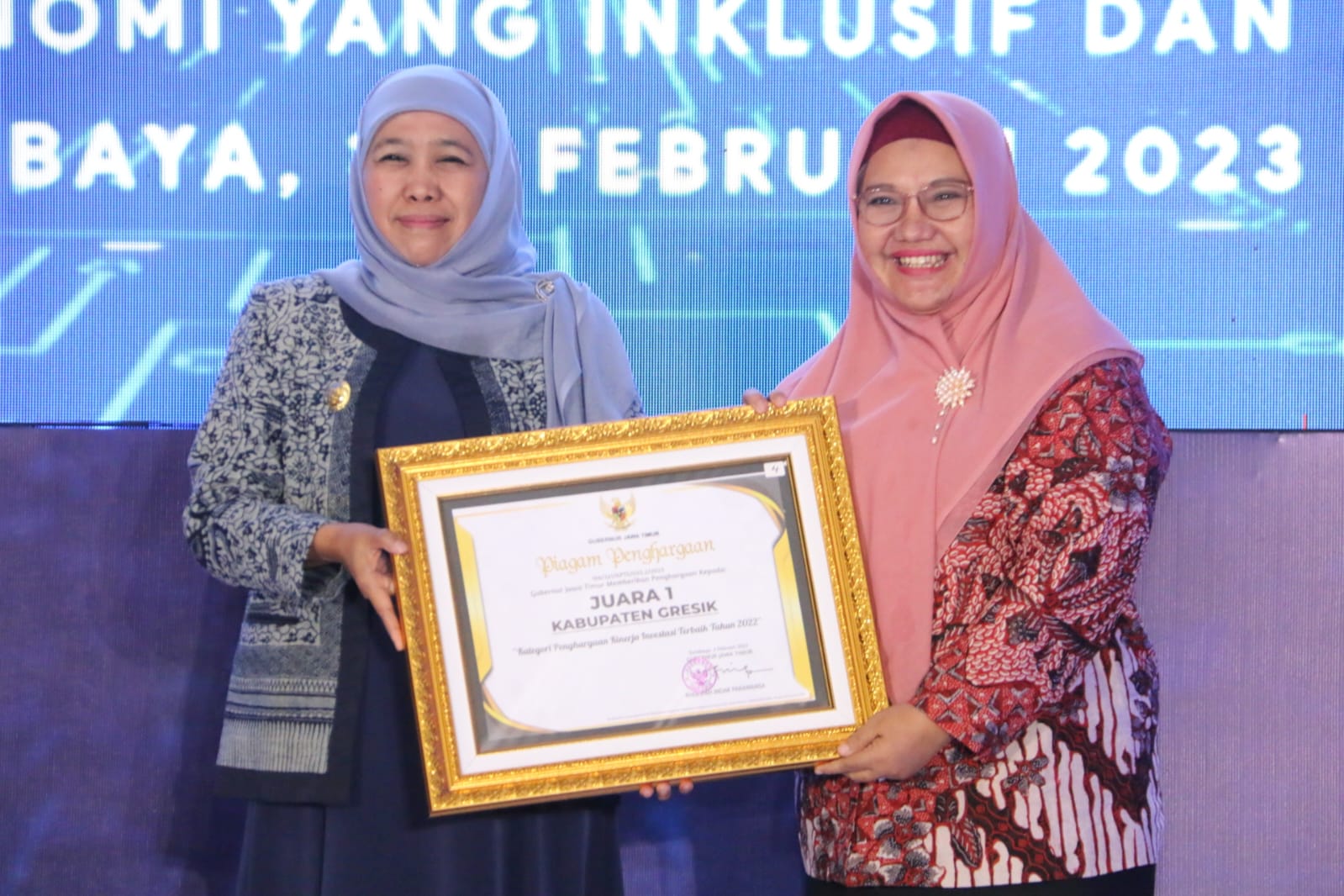 Penghargaan diberikan langsung oleh Gubernur Provinsi Jawa Timur Khofifah Indar Parawansa, bersama Kepala Perwakilan Bank Indonesia Jatim, Budi Hanoto, kepada Wakil Bupati Gresik Aminatun Habibah, Kamis (02/02).
