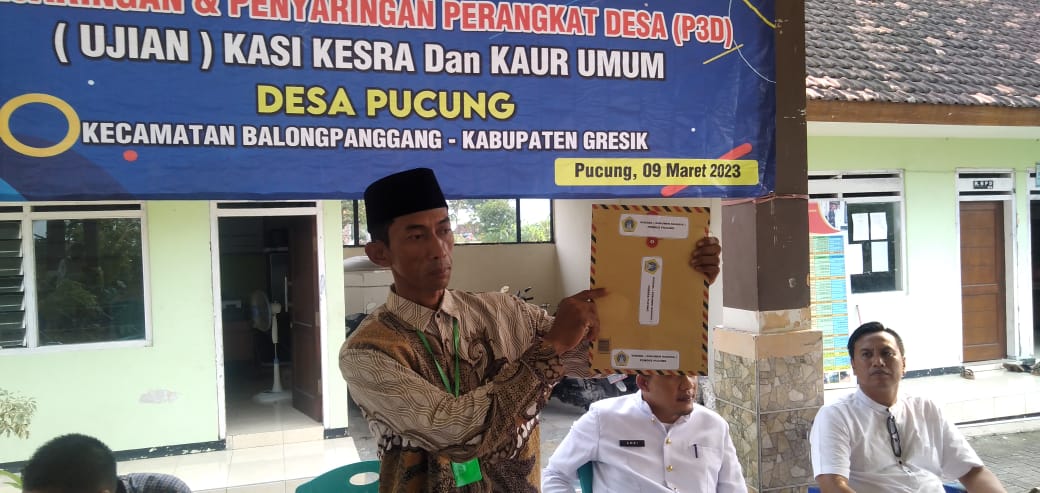 Pelaksanaan ujian tersebut ditetapkan dan dilaksanakan oleh panitia P3D desa Pucung ini diikuti lima peserta. Tiga diantaranya, merebutkan jabatan Kasi Kesra dengan hasil yang didapat,