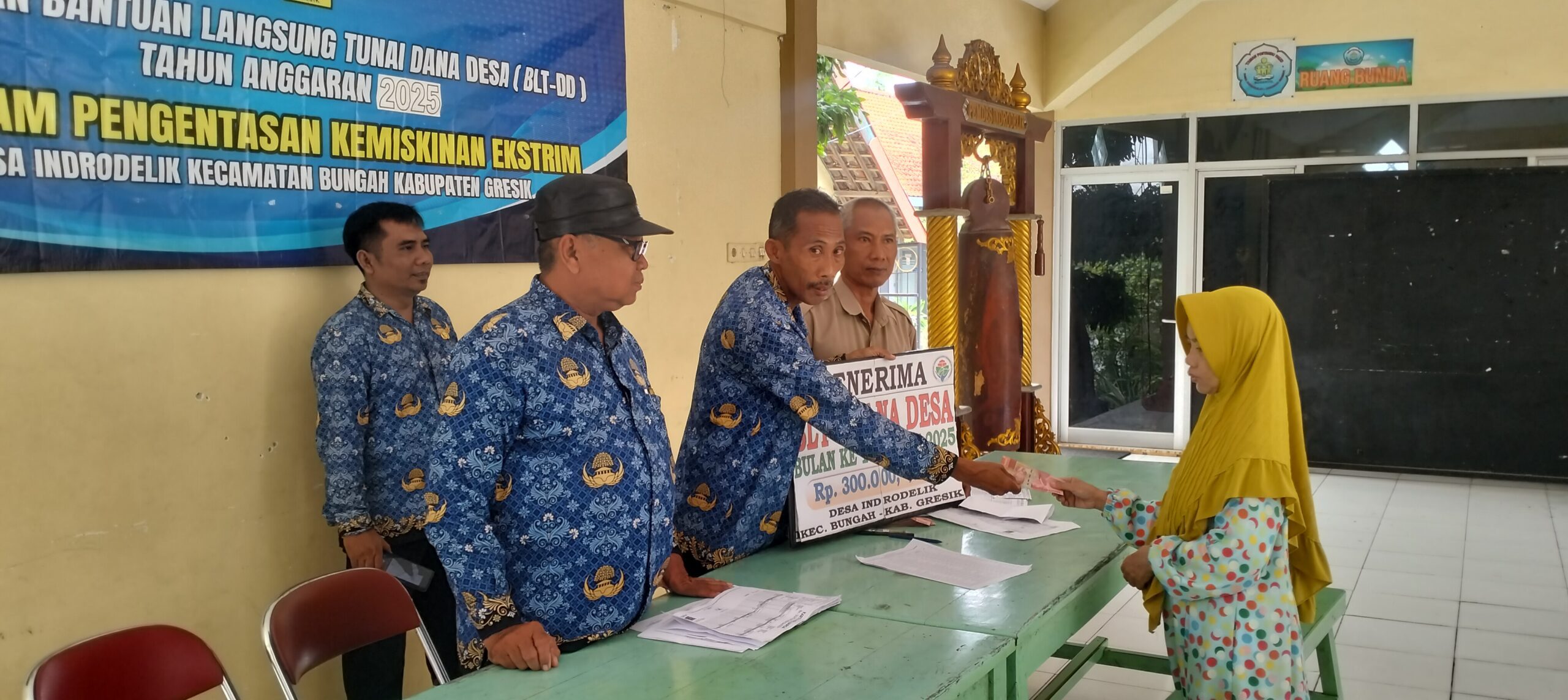 Gresik, November 2025 https://mediarestorasiindonesia.co.id Pemerintah Desa Indrodelik, Kecamatan Bungah, Kabupaten Gresik, kembali menyalurkan Bantuan Langsung Tunai Dana Desa (BLT-DD) tahap ke-11 sebagai bagian dari Program Pengentasan Kemiskinan Ekstrem yang dicanangkan pemerintah pusat. Penyaluran berlangsung di Balai Desa Indrodelik dan berjalan tertib dengan pengawasan pemerintah desa Indrodelik.