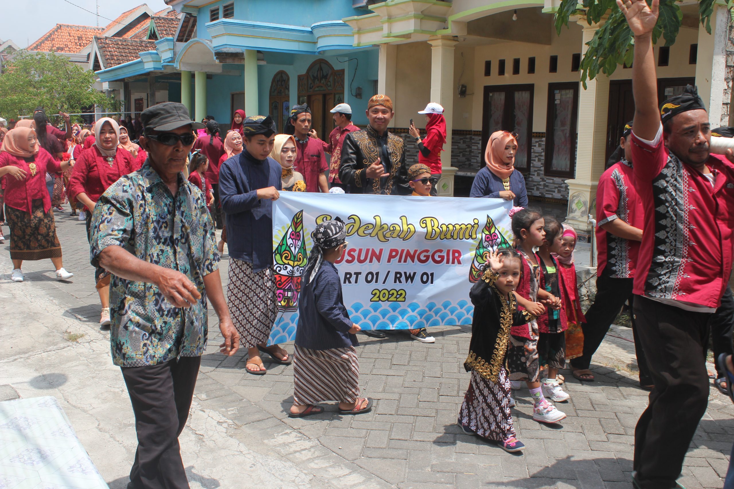 Iring-iringan Ratusan warga masyarakat Desa Pinggir yang mengikuti Kirab Budaya Sedekah Bumi, terlihat sangat menarik, dikarenakan warga masyarakat Desa Pinggir Berpakaian berpakaian adat jawa dalam meramaikan acara tersebut mulai dari anak-anak hingga orang dewasa.