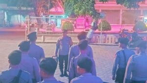 Gresik https://mediarestorasiindonesia.co.id Kapolsek Balongpanggang AKP Moch Dawud melakukan pengamanan saat acara pengesahan calon warga baru perguruan pencak silat, di simpang tiga kecamatan Balongpanggang. Minggu (07/07/2024).Malam.