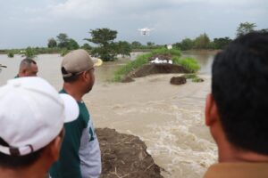 “Dari laporan yang saya terima, jebolnya tanggul ini terjadi pukul 11.00 wib yang hanya 1,5 meter. Namun beberapa jam kemudian sudah mencapai hampir 30 meter akibat tanah penahan tanggul tergerus air. Maka saya minta kepada Dinas terkait dan dibantu TNI-Polri untuk membantu proses evakuasi. Saya lihat BPBD juga sudah mendirikan tenda darurat bagi warga,” katanya.