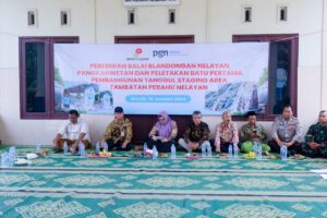 Selanjutnya Wabup Gresik Bu Min didampingi Kepala Dinas Perikanan Nadlelah dan PGN SAKA Subali melakukan peletakan batu pertama pembangunan staging area tambatan perahu sekaligus meresmikan balai blandongan nelayan Pangkahwetan.